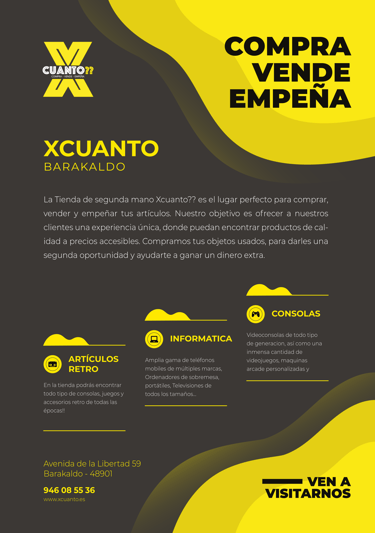 Colaboración integral con XCuanto, tienda de segunda mano ubicada en Barakaldo, especializada en la compra, venta y empeño de artículos diversos, incluyendo tecnología, consolas, videojuegos, coleccionables y más. El proyecto incluyó la creación de videos dinámicos para redes sociales, así como el diseño de flyers, tarjetas y material promocional impreso, todo alineado con una identidad visual moderna y accesible.